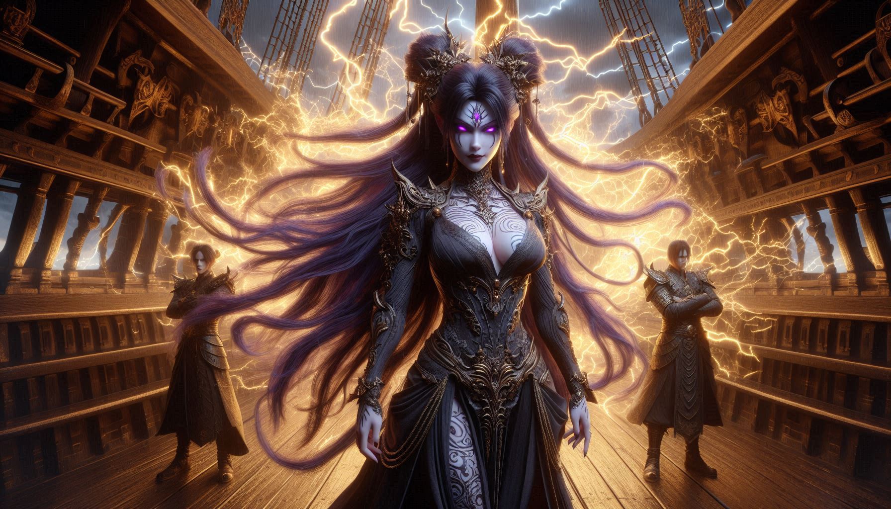 Pour la deuxième fois, des monstres se présentèrent à sa cellule. Bien qu’ils étaient recouverts de sang verdâtre, ils se présentèrent devant l’homme et la jeune fille avec cet air intéressé, comme s’ils cherchaient des trésors. Les deux premiers dont leurs armures recouvraient l’entièreté de leur corps et malgré leur teint blafard avait une apparence plus humaine que tous les autres. Peut-être n’était-ce là qu’une tentative de tromper leurs adversaires car ce qu’il avait vu lors de l’abordage, n’étaient guère autre que des êtres aux têtes de macchabées s’attaquer à ces lézards. Quand leur chef se présenta, ils s’agenouillèrent aussitôt en preuve de respect et laissèrent passer devant eux une femme assurément aussi monstrueuse. Portant des épaulières dorées et pointues, une longue robe fusionnée à une armure légère qui épousait ses courbes, des tatouages sur toutes les parcelles de chaire apparentes et un visage abritant un regard violacé profond dont les marques donnaient la sensation que le monstre qui se cachait derrière cette apparence était bien plus féroce. À s’y méprendre, ces assaillants pouvaient être pris pour des humains au premier abord, mais la nécrose qui régnait dans l’air et ce regard propre à un prédateur affamé devant une proie condamnée rompait avec les intentions d’un humain. L’espace d’un instant, Enelis songea que ça n’était pas forcément plus malsain de savoir exactement ce à quoi ou à qui il avait à faire que de ne pas connaître la mesquinerie des hommes.