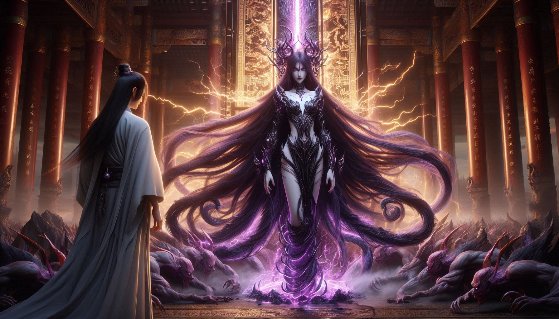 De son regard violacé, elle s’avança jusqu’à lui, méfiante et lui fit preuve d’une attention particulière qui suggéra qu’il aille jusqu’au bout de ses propos. Dans un jeu de mimique, Enelis lui proposa de le défaire de ses liens afin qu’il puisse y répondre. Assise à nouveau elle y envoya des soldats pour le libérer, et fit maintenir la jeune fille sous la lame affûtée d’un autre. Dans le même temps, dans le royaume éthérique, l’âme spirituelle de l’humain tenait fermement le marteau qu’il y avait forgé quand il était à l’académie Huang jadis, et s’apprêtait à pourfendre le bourreau de l’interprète.